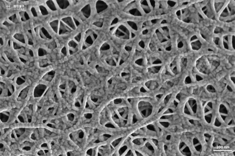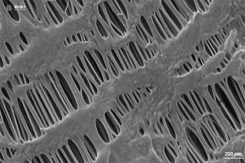 使用扫描电镜可以观察隔膜的孔径尺寸和分布均匀性,还可以对多层和有涂覆隔膜的截面进行观察,测量隔膜厚度。传统的商业化隔膜材料多为聚烯烃材料所制备的微孔膜,包括聚乙烯(PE)、聚丙烯(PP)单层膜及PP/PE/PP三层复合膜。聚烯烃类的高分子材料绝缘不导电,并且对电子束非常敏感,高压下观察会导致荷电效应,高分子隔膜的精细结构也会被电子束损伤。国仪量子自主研发的SEM5000型场发射扫描电镜,具备低压高分辨的能力,可以在低压下直接观察隔膜表面的精细结构,并且不会对隔膜产生损伤。
