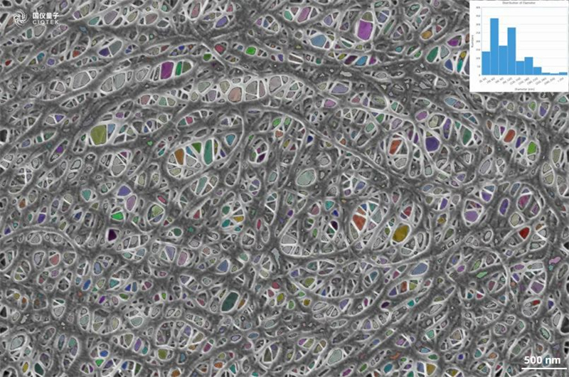 湿法即热致相分离法,将聚合物与高沸点溶剂等混合熔融,经过降温相分离、拉伸、萃取干燥、热处理定型等工艺制得微孔膜。与干法工艺相比较,湿法工艺稳定可控,制得的隔膜厚度薄、力学强度高、孔径分布均匀且相互贯穿(图2)。使用湿法工艺制得的隔膜虽然成本高于干法工艺,但组装后的电池能量密度高、充放电性能好,多应用于中高端的锂离子电池。结合国仪量子自主研发的孔径分析系统,可以对隔膜的孔径、孔隙率等特征进行快速自动化的分析(图3)。
