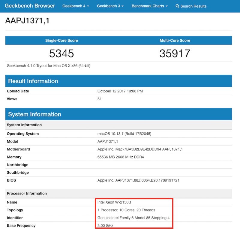 所有 iMac Pro 型号都被识别为 AAPJ1371,1,与其他至强芯片不同,这些处理器的后缀有 B。根据 Geekbench 创始人 John Pool 推测,他认为 iMac Pro 可能需要 TDP 设计更低的芯片,这样频率更低,可以改进散热,毕竟 iMac Pro 仍然是一款一体机。至强 W 系列芯片中,都是采用 140W 高 TDP 设计的型号。
